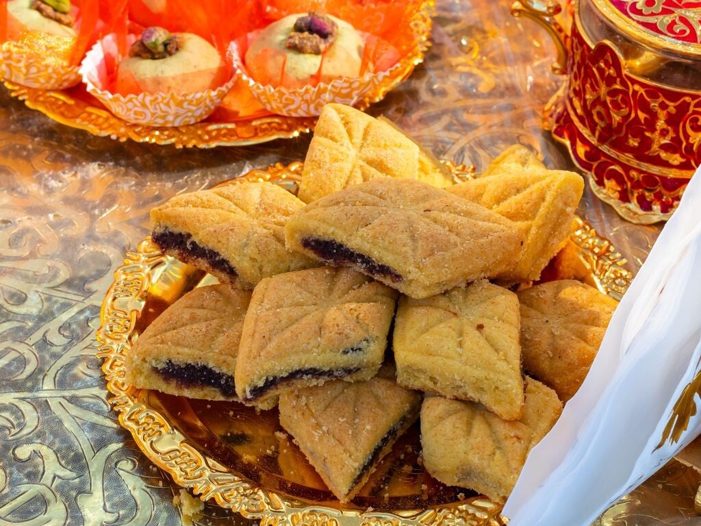 Gâteau de semoule en forme de losange fourré aux dattes parfumées à l'eau de fleur d'oranger, frit puis trempé dans le miel.